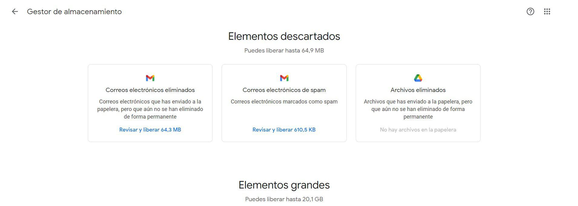 Para quitar uno o varios archivos que ocupen espacio en Fotos, Gmail o Drive puedes usar el Administrador de almacenamiento de Google One. Para eso debes ingresar aquí. Allí verás el contenido filtrado por tamaño así como el material que ya fue descartado en la papelera y se puede borrar definitivamente.