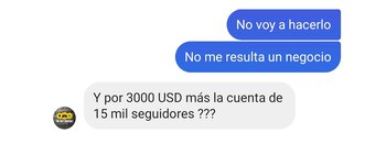 A cambio ofrecen, no solo el dinero en dólares, sino una cuenta (sin verificar) con 15.000 seguidores de Argentina, reales (no bots). ¿Y qué pasa si la persona se niega a esa propuesta? Pueden ofrecer más dinero. En este caso citado, llegaron a ofrecer USD 3.000, y se mostraron abiertos al diálogo.