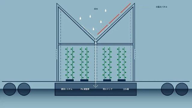 Su techo está diseñado en forma de V para que pueda canalizar el agua de lluvia de forma eficiente, así el agua recolectada por el techo se mezcla con la de mar para ajustar su nivel de pH y producir un abono que ayuda al crecimiento de los cultivos.
