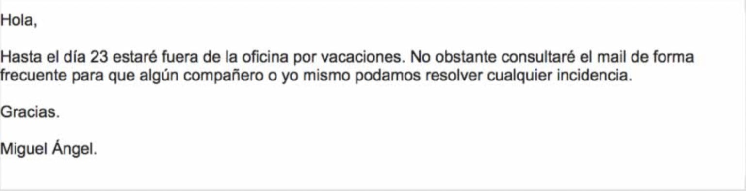 6. También ofrece la posibilidad de escribir un tema y un texto breve donde puede indicar que no estará disponible durante este período. Incluso puede indicar quién será el responsable de su trabajo en su ausencia.