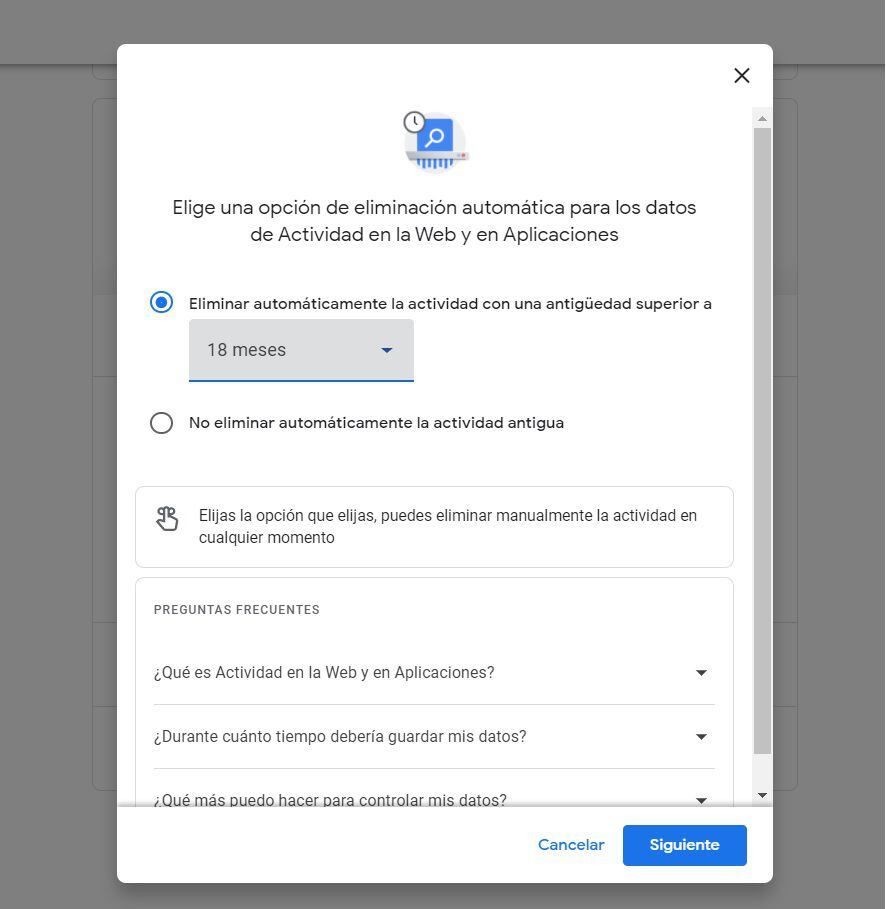El usuario también puede optar por eliminar el registro de la actividad en la web y aplicaciones. Esto se puede hacer de manera manual o bien activar la eliminación automática que permite establecer un período predeterminado para esta acción. Hay tres opciones: 3, 18 y 36 meses. Esta herramienta está disponible también para el historial de YouTube y de ubicaciones. En todos los casos se accede a la configuración el apartado Mi Actividad.
