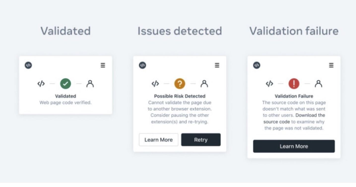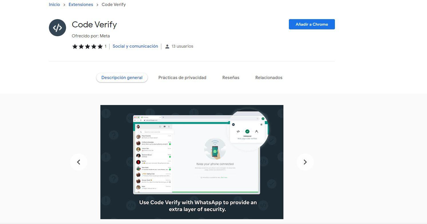 Code Verify le que permite a los navegadores corroborar que los recursos no hayan sido manipulados. Cada vez que se usa WhatsApp Web, la extensión compara la huella digital o hash del código recibido en el navegador con el hash del código de WhatsApp.