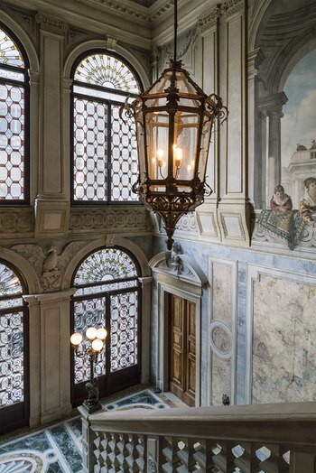El piano nobile lleva la firma de uno de los principales exponentes de los estilos neorrenacentista y rococó de mediados y finales del siglo XIX, Michelangelo Guggenheim, y de allí se llega al cuarto nivel, donde además de un salón de reuniones y la biblioteca se accede a la zona de relajación y a una terraza, desde donde no solo se aprecia la ciudad en todo su esplendor sino también la silueta de los lejanos Alpes que se difuminan en el horizonte.