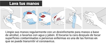 - Limpiar las manos regularmente con un desinfectante para manos a base de alcohol o lavarlas con agua y jabón. Tocarse la cara después de tocar superficies contaminadas o personas enfermas es una de las formas que se puede transmitir el coronavirus.