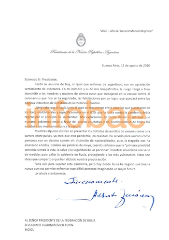 Tal como adelantara Infobae, en este lado del Cono Sur la buena noticia hoy se hizo escuchar: Rusia enviará a la Argentina 10 millones de dosis de la vacuna Sputnik V antes de finalizar el año, como consecuencia de la firma de un acuerdo por el hallazgo científico del Instituto Gamaleya.
