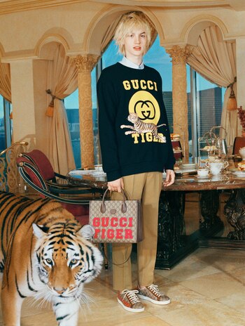 El Gucci Tiger mostró su fascinación por la naturaleza y el felino con una selección de prendas en donde se muestra al animal pintado a mano.