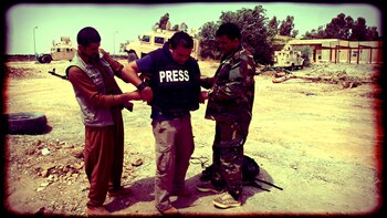 C.J. Chivers, un exsoldado de la infantería de marina de Estados Unidos que pasó años en The Times como corresponsal de guerra, se entrenó para poder cargar a su fotógrafo con el fin de llevarlo hasta un lugar seguro en caso de que le dispararan o recibiera impactos de fragmentos de bomba.