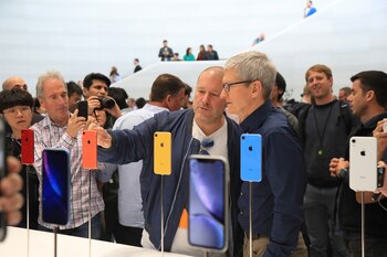 El entonces director de diseño de Apple, Jony Ive, izquierda, y su director ejecutivo, Tim Cook, en un evento de Apple en Cupertino, California, el 12 de septiembre de 2018. (Jim Wilson/The New York Times)