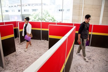 Unos visitantes pasean por la obra de Amala Pica “¡Que viva el papeleo!”, que evoca la sensación de una oficina corporativa, en el Museo Jumex de Ciudad de México, el 26 de septiembre de 2023. (Brian Harkin/The New York Times)
