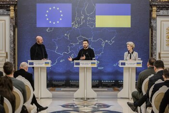 El presidente de Ucrania, Volodímir Zelenski, al centro; Charles Michel, presidente del Consejo Europeo, a la izquierda; y Ursula von der Leyen, presidenta de la Comisión Europea, en una conferencia de prensa durante una cumbre en Kiev, el 3 de febrero de 2023. (Emile Ducke/The New York Times)