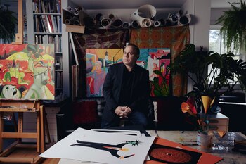 El artista político Edel Rodríguez, que dibujó algunas de las imágenes más provocadoras de la presidencia de Trump, en el estudio de su casa en Mount Tabor, Nueva Jersey, el 13 de octubre de 2023. (Amir Hamja/ The New York Times).