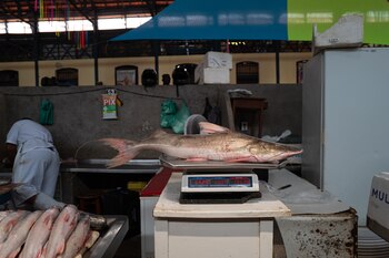 Pesando un pescado en Ver-o-Peso, un bullicioso mercado de productos amazónicos, en Belén, la capital de estado de Pará, Brasil, en noviembre de 2023. (Alessandro Falco/The New York Times)