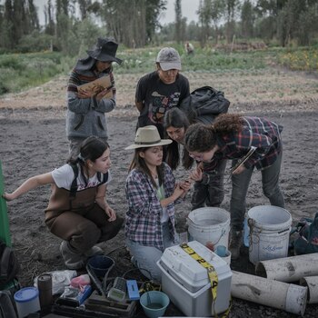 Con el bote amarrado, los estudiantes desembarcaron en su primera chinampa, una granja repleta de hortalizas con hileras de girasoles, maíz, verduras de hoja y tomates. Javier del Valle, copropietario y chinampero de cuarta generación, observó cómo Zambrano y Sumano cavaban una saliente en la tierra negra de las orillas de su canal y empezaban a hundir una de sus jaulas de bambú de casi dos metros de alto, difíciles de manejar. Los estudiantes sumergieron sus instrumentos para medir el oxígeno disuelto, la turbidez y la conductividad. "¿Cómo está el oxígeno?", quería saber Zambrano.