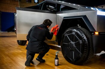 Un modelo de Cybertruck de Tesla puliéndose durante un evento de la Agencia de Protección Ambiental en Washington, el 20 de marzo de 2024. (Pete Kiehart/The New York Times).