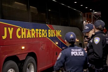 Miembros de la policía de la Autoridad Portuaria de pie junto a un autobús alquilado que trajo migrantes desde Texas hasta Manhattan, el 28 de diciembre de 2023. (Anna Watts/The New York Times)