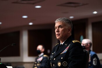Paul M. Nakasone, general de cuatro estrellas que dirigió la Agencia Nacional de Seguridad y ahora forma parte del consejo de administración de OpenAI, en una audiencia en el Capitolio en Washington el 25 de marzo de 2021. (Anna Moneymaker/The New York Times)