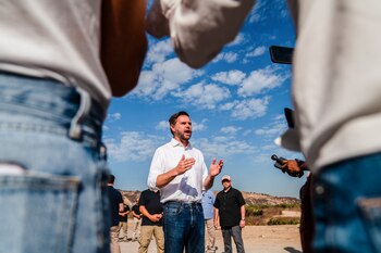 El senador de Ohio JD Vance, candidato republicano a la vicepresidencia, habla con la prensa en San Diego durante una visita a la frontera con México el viernes 6 de septiembre de 2024. (Ariana Drehsler/The New York Times)