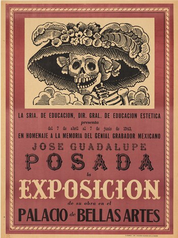 Cartel que anuncia una exposición de obras de José Guadalupe Posada en el Palacio de Bellas Artes, Ciudad de México, 1943. En él aparece "La catrina", su famoso grabado de un esqueleto femenino con un enorme sombrero de plumas. (vía The Metropolitan Museum of Art, New York vía The New York Times)