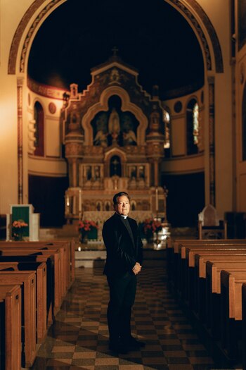Un domingo reciente, en Nuestra Señora del Monte Carmelo, solo cabía gente de pie mientras monseñor Gigantiello oficiaba la misa vestido con elaborados ornamentos verdes y blancos.