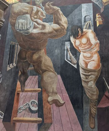 Detalle del mural de Philip Guston-Reuben Kadish, "La lucha contra el terrorismo", 1935, tras su restauración en Morelia, México, 2025. (vía The Estate of Philip Guston and Hauser & Wirth vía The New York Times)