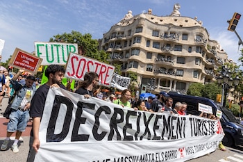 En Barcelona, centro de recientes protestas contra el turismo excesivo en las ciudades europeas, manifestantes con pancartas en las que se leía "Turistas, vayan a sus casas" y "El turismo nos roba" marcharon por la llamada Milla de Oro de la ciudad, una calle flanqueada por boutiques de lujo y hoteles de alta gama, rociando a los visitantes con pistolas de agua frente a una tienda de Louis Vuitton. En el exterior de un hostal cercano, se produjo una refriega con los empleados, y algunos manifestantes lanzaron fuegos artificiales. Una barricada policial detuvo la marcha cerca de la Basílica de la Sagrada Familia, una de las principales atracciones turísticas de la ciudad.