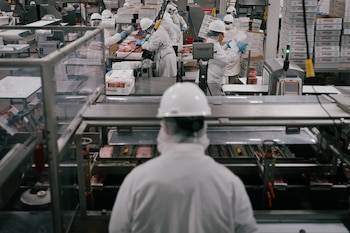 Otro encargado informó a los empleados sobre la seguridad alimentaria y repartió batas blancas y cascos de construcción. Luego abrió la puerta de la fábrica y se oyó una ráfaga de aire frío y el traqueteo de las máquinas. Los trabajadores se alinearon junto a un eslogan de la compañía, impreso en la entrada.