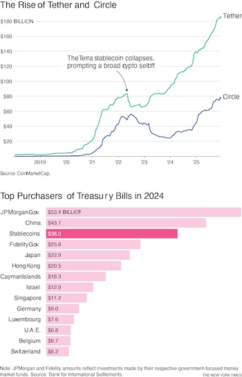 Ahora, los emisores de stablecoins son algunos de los mayores compradores de letras del Tesoro. Circle y Tether poseen en conjunto más de 200.000 millones de dólares en letras del Tesoro, según un análisis de sus estados financieros, lo que los sitúa al mismo nivel que las grandes naciones y los inversionistas institucionales.