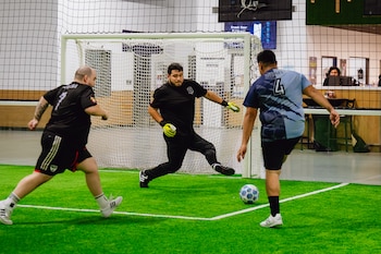 Joseph Alvarado Delgado, portero del Fatty Liverpool Football Club, en el centro, detiene un disparo del K-FC Dallas durante un partido de la liga de fútbol Man v Fat en el TOCA Soccer Center de Keller, Texas, el miércoles 7 de enero de 2026. (Desiree Ríos/The New York Times)