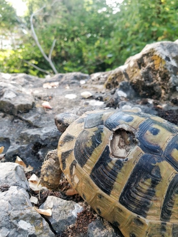 Una tortuga de Hermann hembra de la isla de Golem Grad, en Macedonia del Norte, con una herida de una caída en el caparazón. (Dragan Arsovski vía The New York Times)