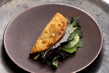 Caballero, cuya infancia transcurrió entre El Paso y el fronterizo estado mexicano de Chihuahua, y que ha trabajado en China y en el País Vasco español, está interesado en las conexiones y en cómo la comida de un pueblo puede reflejar la de otro. Sus tortillas son excepcionales, elásticas y flexibles, con pliegues masticables y manchas de carbón. Están emparentadas con las sobaqueras del norte de México, grandes tortillas onduladas y ampolladas al wok, así como con las tortitas de cebollín hojaldradas que comía cuando era un joven cocinero en Shanghái.