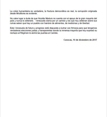 "Nuevamente vimos a todo el aparato del Estado abusando de su poder, incluyendo el uso perverso del 'carnet de la patria', para someter la voluntad de un pueblo en situación de extrema necesidad", se lee en un comunicado de la MUD, emitido minutos después de que el presidente del país, Nicolás Maduro, celebrara su victoria en más de 300 de las 335 alcaldías.