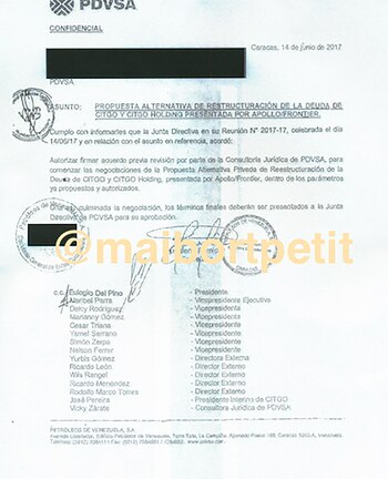El proyecto debía ser firmado previo a una revisión por parte de la Consultoría de Pdvsa. De acuerdo a evidencias publicadas por la periodista venezolana Maibort Petit en su blog, la propuesta de refinanciamiento de la deuda de Citgo con las firmas Frontier y Apollo finalmente fue aprobada por la petrolera en junio de 2017.