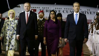 Erdogan llegó acompañado de su esposa, Emine Erdogan, y fue recibido por la vicepresidenta Ejecutiva, Delcy Rodríguez; el vicepresidente económico, Tareck el Aissami y el ministro de Finanzas, Simón Zerpa, en el Aeropuerto Internacional de Maiquetía, que sirve a Caracas.