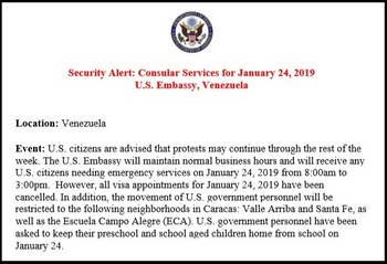 Los funcionarios estadounidenses, a quienes Maduro dio un plazo de 72 horas para que abandonen el país, recibieron la orden de restringir sus movimientos a los barrios de Valle Arriba y Santa Fe, y recomendaron no enviar a sus hijos a las escuelas y jardines por esta jornada.