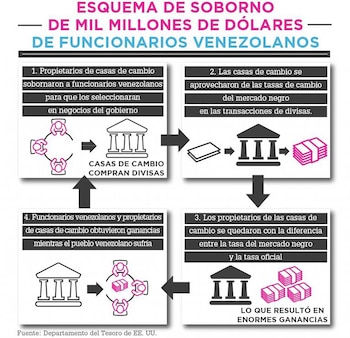 El primer paso de esta red denunciada por el Departamento de Estado consiste en que propietarios de casas de cambio sobornaron a funcionarios venezolanos para que los seleccionaran en negocios del gobierno.