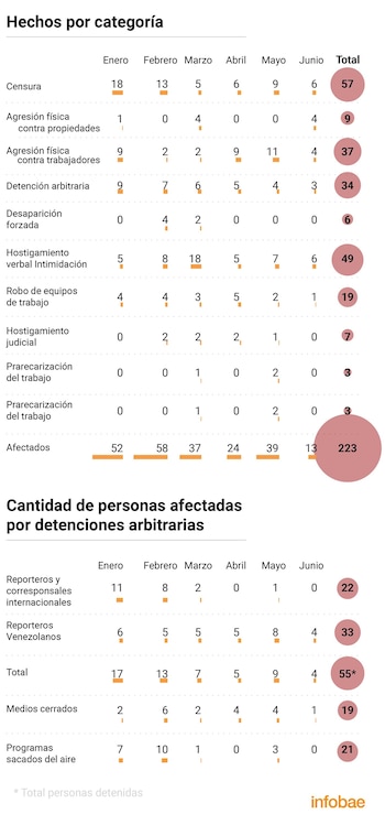 En enero, hubo 18 casos de censura, 1 de agresión física contra propiedades, 9 de agresión física contra trabajadores, 9 detenciones arbitrarias, ninguna desaparición forzada, 5 hostigamientos verbales o intimidaciones, ninguna muerte, 4 robos de equipos de trabajo y ningún hostigamiento judicial.