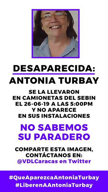 "ATENCIÓN: reportan la desaparición forzosa de Antonia Turbay. Vecinos señalan que a Antonia se la llevó una camioneta del SEBIN el 26/06/2019 a las 5:00pm. – ¿Dónde está Antonia?", escribió Romero.