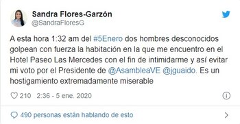 Otro en denunciar el asedio fue la diputada Sandra Flores-Garzón: “A esta hora 1:32 am del #5Enero dos hombres desconocidos golpean con fuerza la habitación en la que me encuentro en el Hotel Paseo Las Mercedes con el fin de intimidarme y así evitar mi voto por el Presidente de la Asamblea Nacional, Juan Guaidó. Es un hostigamiento extremadamente miserable”, sentenció.