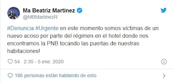 “#Denuncia #Urgente en este momento somos víctimas de un nuevo acoso por parte del régimen en el hotel donde nos encontramos la PNB tocando las puertas de nuestras habitaciones!”, denunció la diputada María Beatriz Martínez.