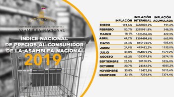 El Parlamento, único poder en manos de la oposición, divulga desde 2017 su propio índice inflacionario, luego de que el régimen dejara de publicar cifras oficiales en 2016. El Banco Central de Venezuela rompió el silencio en mayo pasado cuando reveló que la inflación en 2018 había llegado a 130.060% (cifra, no obstante, casi 11 veces menor a la reportada por la Asamblea Nacional). El FMI, por su parte, había previsto que la inflación llegaría a 1.000.000%, pero recortó su predicción a 200.00%.
