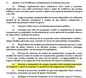 “Me preocupa profundamente la reducción del espacio democrático, en particular la continua criminalización de la protesta y la disidencia pacíficas. En el contexto del auge de las protestas antigubernamentales ocurridas en todo el país en los dos primeros meses de este año, mi Oficina documentó numerosas violaciones y abusos de derechos humanos perpetrados por las fuerzas de seguridad y grupos progubernamentales armados, los colectivos, incluyendo el uso excesivo de la fuerza, asesinatos, detenciones arbitrarias, torturas, y malos tratos en condiciones de detención, así como actos de amenaza e intimidación”, manifestó la Alta Comisionada para los Derechos Humanos de la ONU durante su presentación.