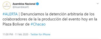 Asimismo, la Asamblea Nacional denunció la detención arbitraria de los colaboradores de la la producción del evento que tuvo lugar en la Plaza Bolivar, el el centro de Caracas, donde Guaidó brindó un discurso tras su llegada.