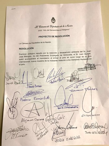 Este miércoles, un grupo de diputados argentinos enviaron un proyecto de resolución a la Cámara local en repudio a la desaparición arbitraria de Máquez. “Expresar enérgico repudio por la retención y desaparición arbitraria del Sr. Juan José Márquez, tío del Presidente Encargado de Venezuela, el Sr. Juan Guaidó, quien acompañaba al mandatario al arribar al país en avión luego de su gira internacional, nueva muestra de la incesante violación a los Derechos Humanos en el país”, reza el comunicado.