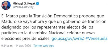 “¿Estados Unidos está negociando con Maduro? NO. Maduro quiere una negociación secreta con el Gobierno de Estados Unidos, pero apoyamos a Juan Guaidó como presidente interino”, ha escrito Kozak en su cuenta oficial de Twitter.