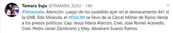 Además de Suárez Ramos, también habrían sido trasladados ilegalmente el capitán Jesús María Alarcón, el coronel José Romel Acevedo y el coronel Pedro Javier Zambrano.