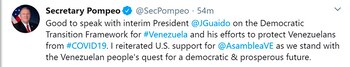 “Hoy conversé con el secretario de Estado Pompeo. Contamos con el respaldo y el trabajo sostenido con nuestros aliados para impulsar la ayuda que necesita nuestra gente y la conformación del Gobierno de Emergencia Nacional para la salvación y reconstrucción de Venezuela”, comentó Guaidó, también en Twitter.