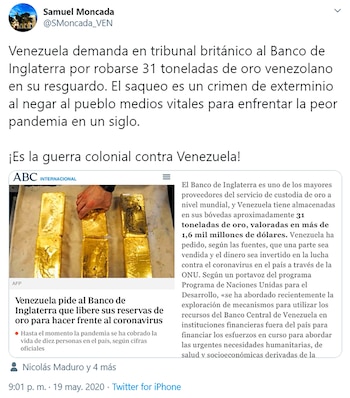 “Venezuela demanda en un tribunal británico al Banco de Inglaterra por robar 31 toneladas de oro venezolano en su resguardo”, expresó Moncada a través de su cuenta en la red social Twitter.