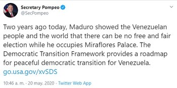 El secretario de Estado de los Estados Unidos, Mike Pompeo, recordó que hoy se cumplen dos años de las últimas elecciones presidenciales en Venezuela y volvió a rechazar al régimen de Nicolás Maduro como vencedor de esos comicios.