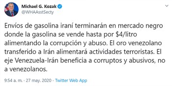 “Envíos de gasolina iraní terminarán en mercado negro donde la gasolina se vende hasta por 4 dólares por litro alimentando la corrupción y abuso. El oro venezolano transferido a Irán alimentará actividades terroristas", expresó en su cuenta de Twitter.
