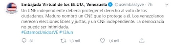 A través de su cuenta de Twitter, la embajada virtual de EEUU en Venezuela denunció: “Un CNE independiente debería proteger el derecho al voto de los ciudadanos. Maduro nombró un CNE que lo protege a él. Los venezolanos merecen elecciones libres y justas, y un CNE independiente. La democracia no puede ser intimidada”.